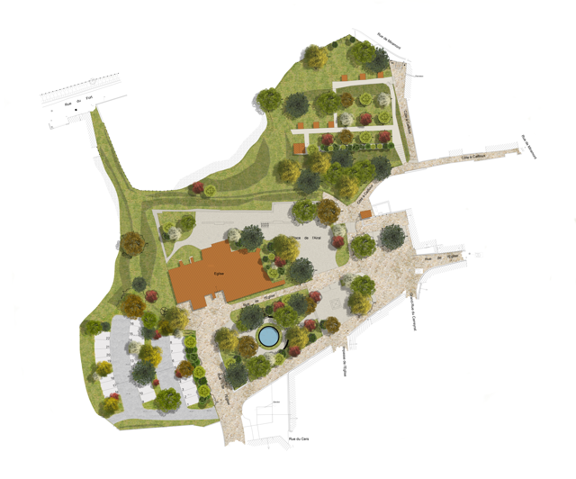 Les aménagements prévoient la requalification du parvis de l’église, la mise en scène du rempart, la réorganisation du jardin public autour du bassin et du monument aux morts, la création d’un belvédère ainsi que d’un parking paysager. L’accent est mis sur la valorisation des matériaux traditionnels (calades, murets en pierre), la végétalisation et le confort d’usage. Les travaux sont actuellement en cours pour l’aménagement des abords de l’église et du jardin public.