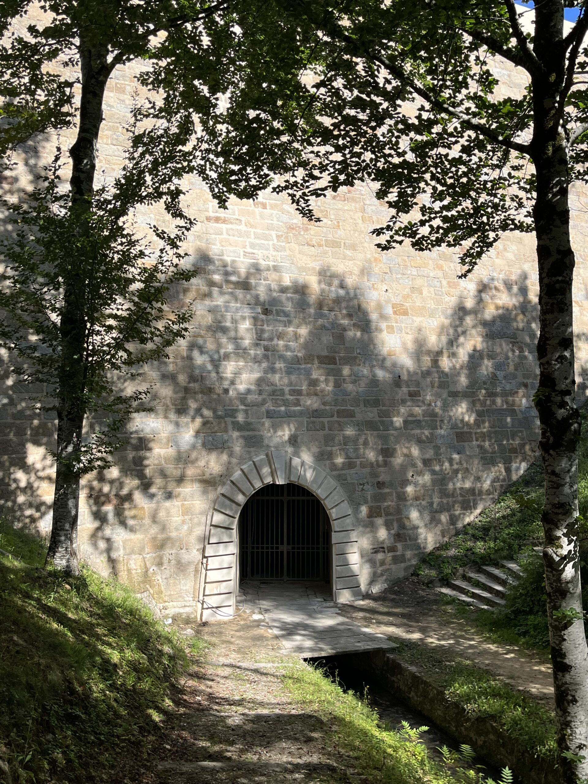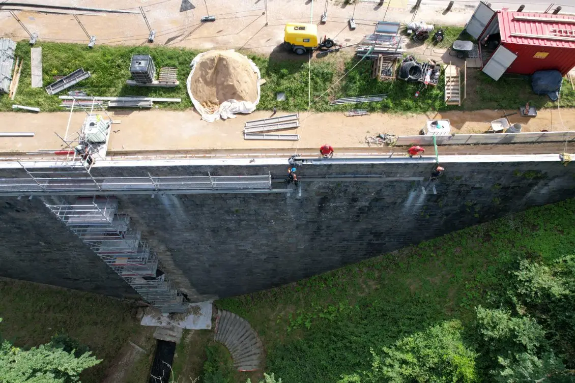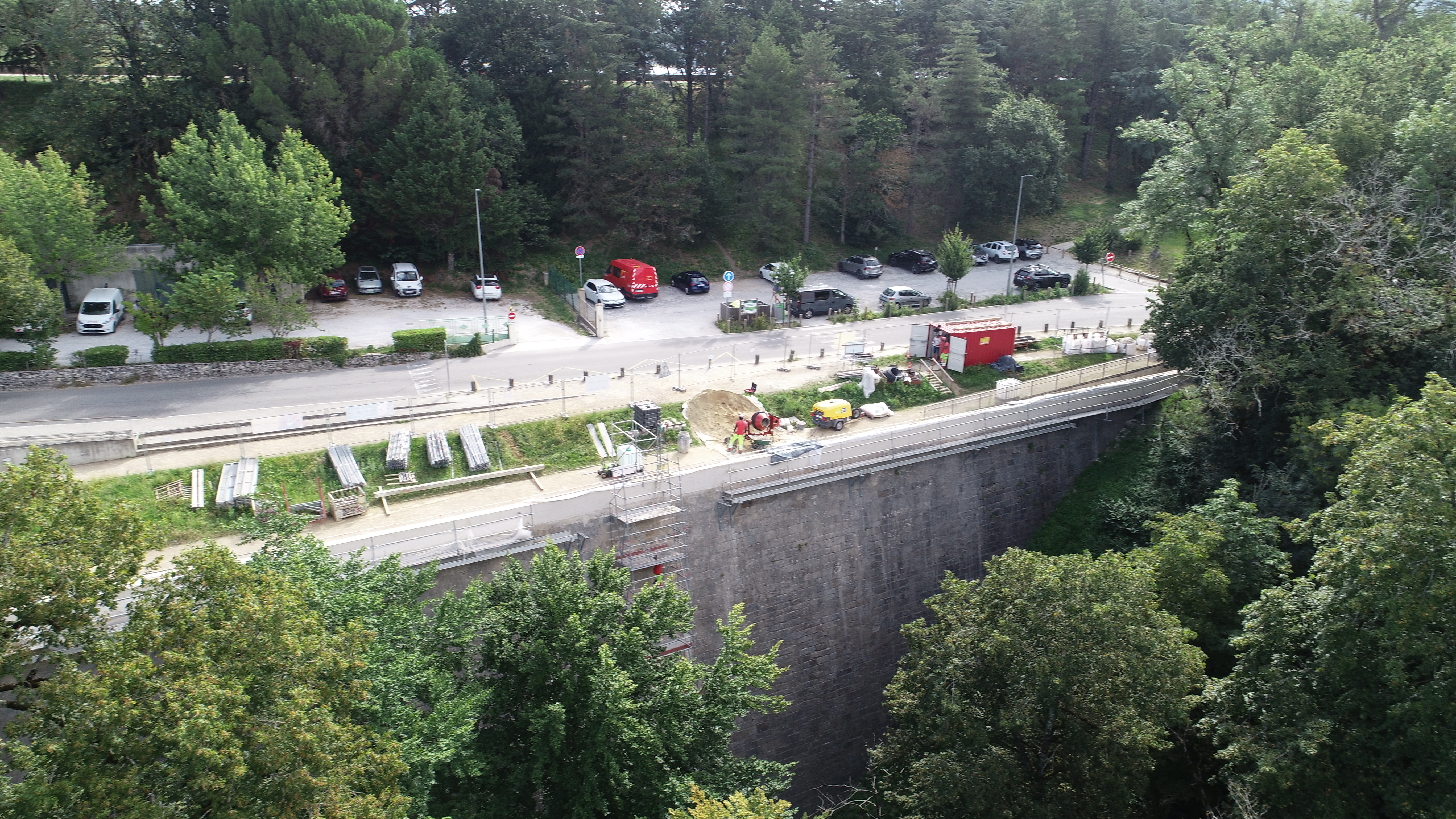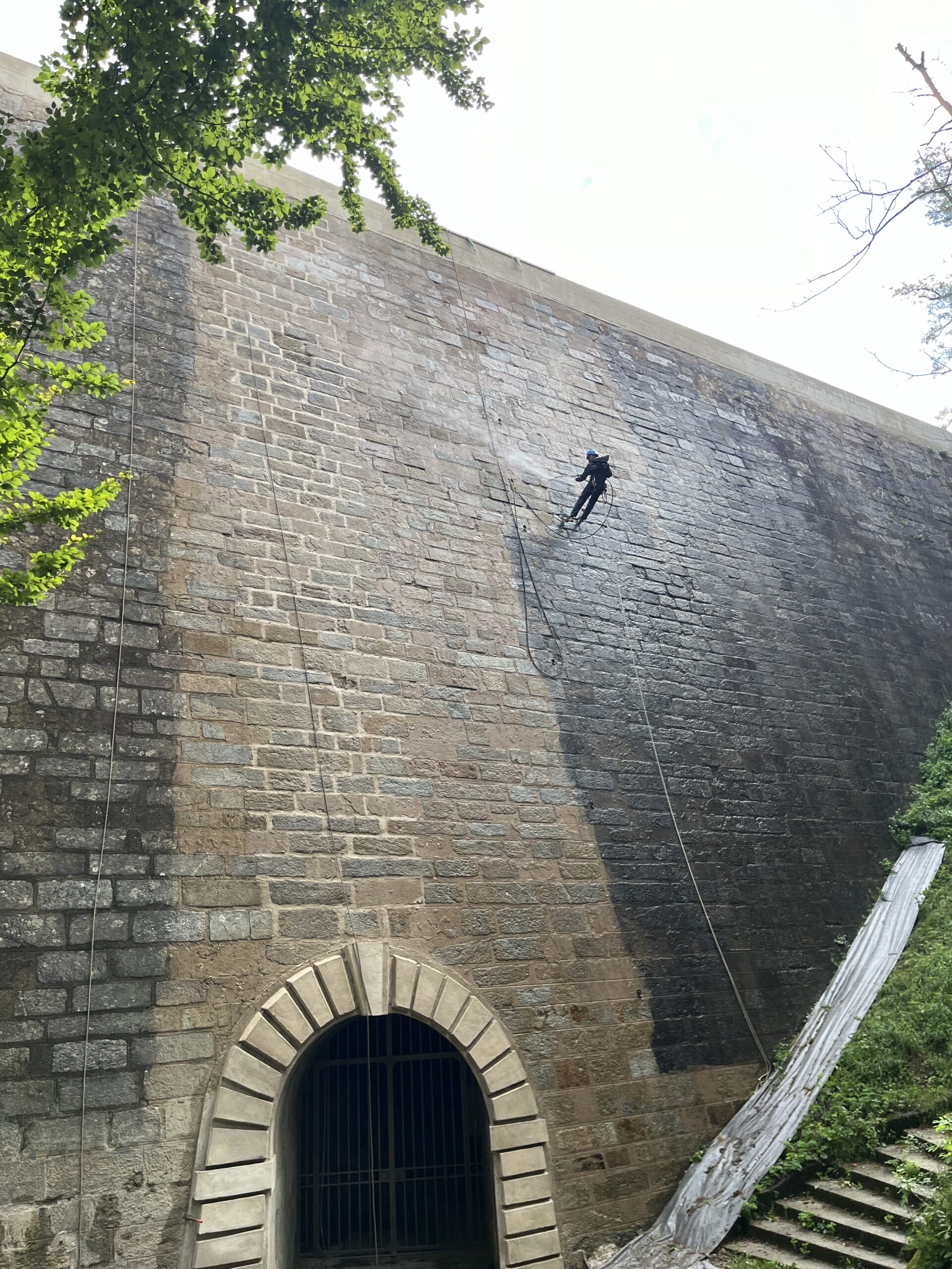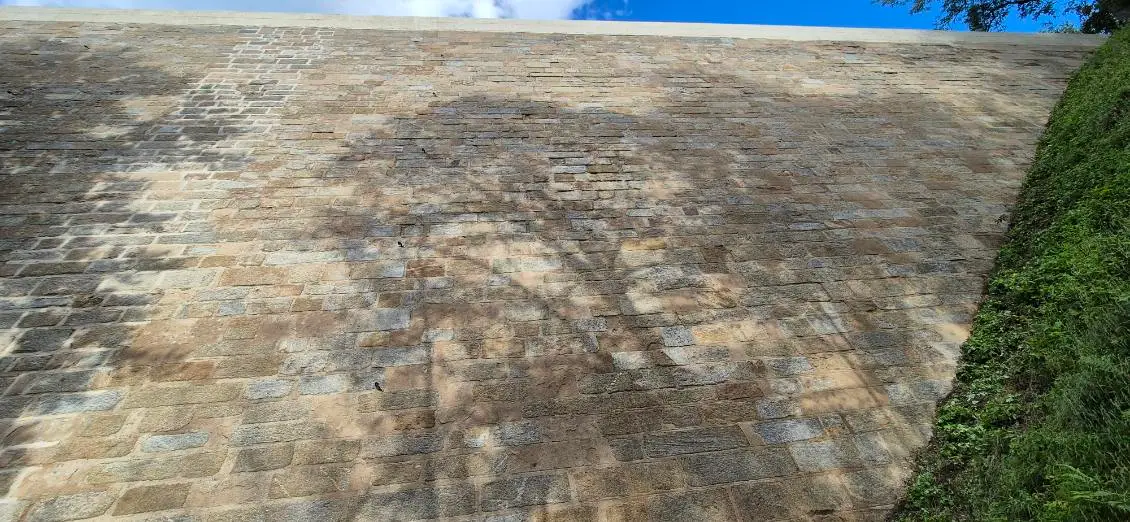Le projet porte sur plusieurs interventions de restauration visant à préserver et sécuriser l’édifice. Le parapet a été repris grâce à un travail minutieux de piquage des enduits, de remaillage des maçonneries et d’injections de coulis de chaux, avant d’être recouvert d’un nouvel enduit à la chaux orné d’un décor imitant la pierre de taille et protégé par un badigeon. L’accès à la voûte de vidange a fait l’objet d’une restitution attentive, incluant la purge des éléments dégradés, la reprise du décor et des badigeons, ainsi que le traitement complet des parements jusqu’à la grille métallique. Enfin, une fissure affectant le parement du XVIIe siècle a été consolidée par un remaillage des maçonneries, un agrafage soigné, des injections de coulis de chaux et un rejointoiement final, assurant la stabilité et la lisibilité de cette partie ancienne de l’ouvrage.